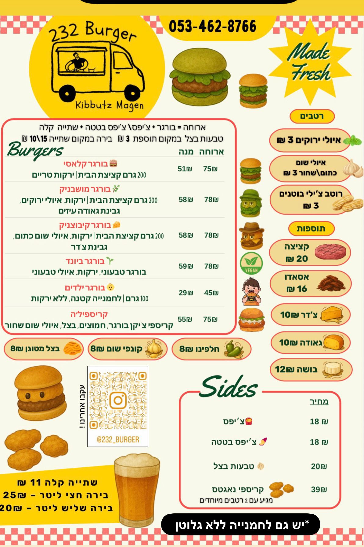 ההמבורגר שלנו נעשה באהבה כבר 15 שנה  טרי יום יום בעבודת יד! ניתן להוסיף עשרות תוספות מיוחדות או לקחת את אחת הקומבינציות המטריפות שלנו, שניתן להפוך גם לטבעוניות! כמובן, יש מנות נוספות לצמחוניים, טבעוניים ואוהבי בשר. בין השעות 12:00 ל-16:00 המקום מגיש עסקיות שוות במיוחד! מענה טלפוני ניתן בין השעות 12:00 - 00:00 בטלפון מספר - 077-7295812 תפריט דיגיטלי