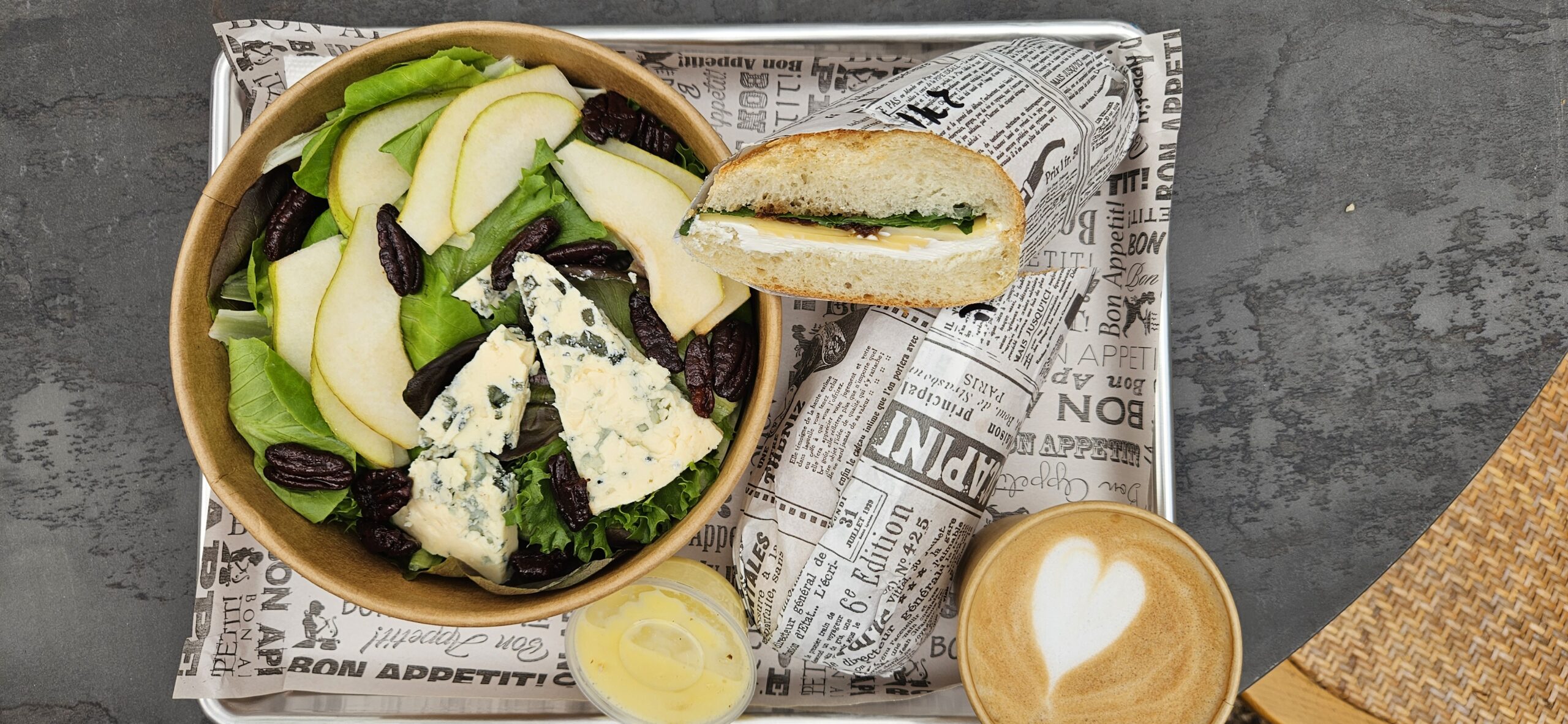 בעגלה מוגש קפה איכותי, לצד כריכים טריים, פיצה פוקצ’ה, סלטים, מאפים וקינוחים.