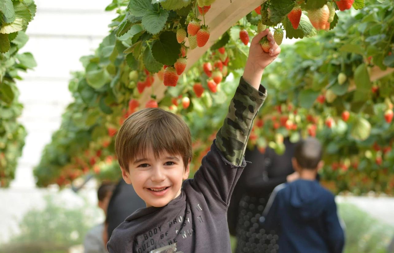 סיור במשק חקלאי פעיל עם קטיף תותים מהשדה, מתנפחים ואווירה משפחתית בלב מרחבי העוטף.